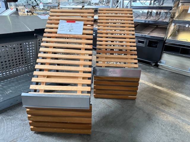 Obst- und Gemüseregale für Supermärkte. Die Regale bestehen aus einer Kombination von Holz und Metall und sind schräg gestaltet, um eine gute Präsentation der Waren zu ermöglichen.