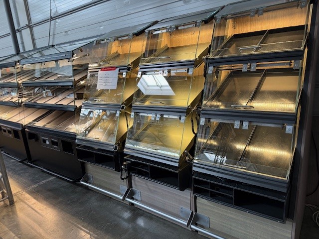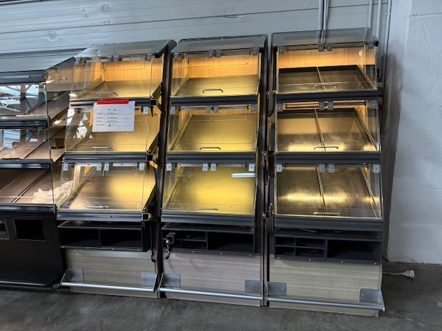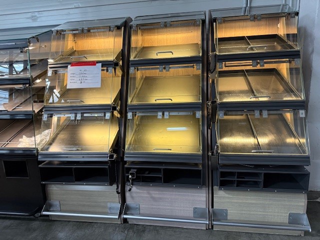 Zum Verkauf stehen 3 hochwertige Brot- und Donut regale in modernem Design mit Plexiglas-Klappen. Ideal für Bäckereien, Supermärkte oder Cafés.