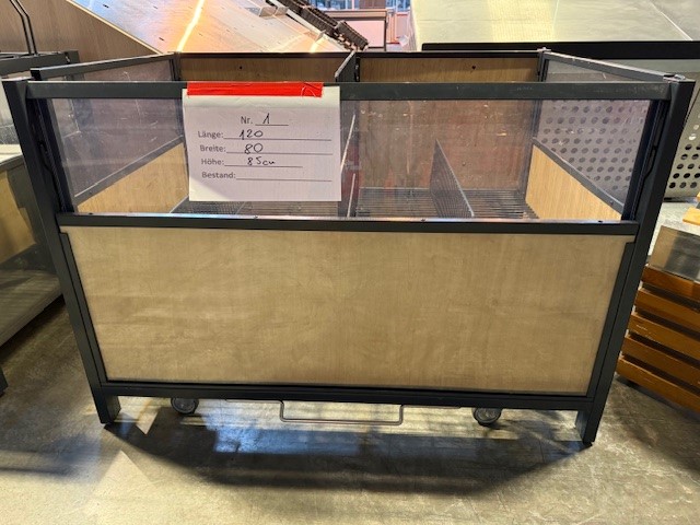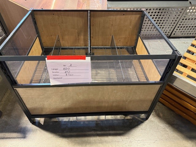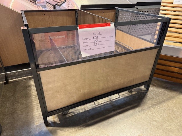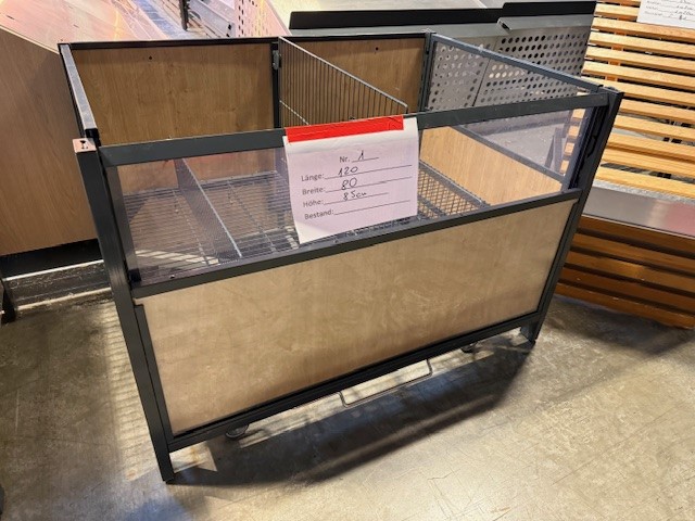 Durch die robuste Metallkonstruktion, die Holzverkleidung und die transparenten Seiten ist die Ware gut sichtbar und ansprechend präsentiert.