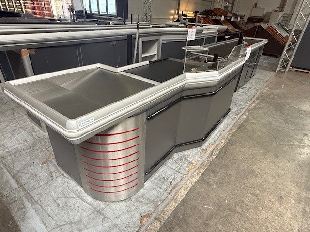 Zum Verkauf steht ein professioneller Kassentisch des renommierten Herstellers POTRÄFKE, ideal für Supermarkt, Discounter oder Einzelhandel.