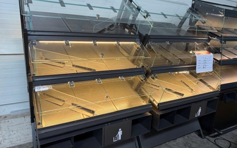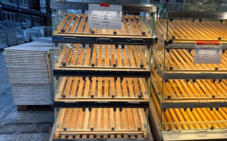 Das Regal verfügt über mehrere Ebenen mit Holzrosten und Glasfronten, die Ihre Backwaren attraktiv und hygienisch präsentieren.