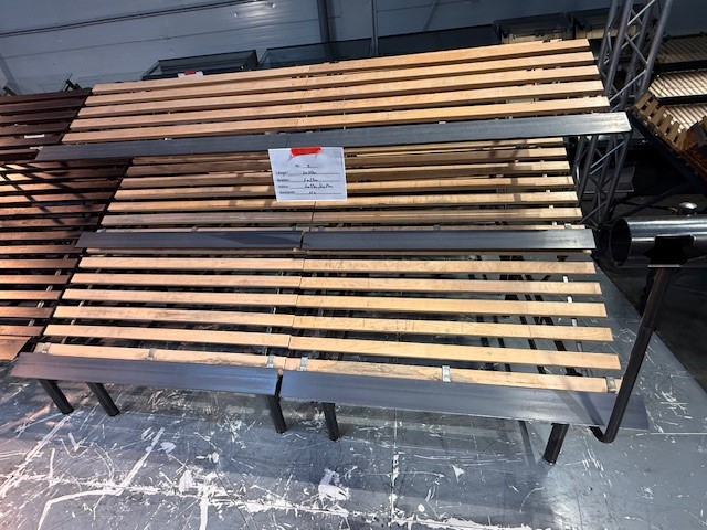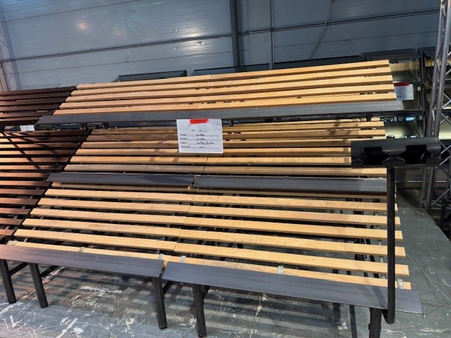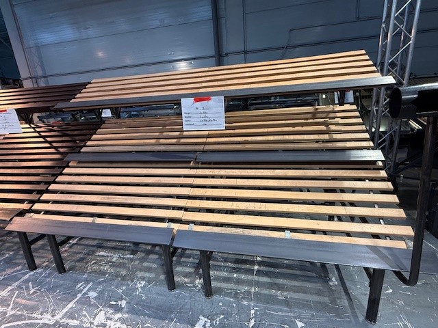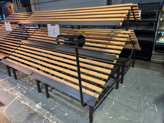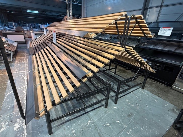Das Gestell besteht aus stabilem, pulverbeschichtetem Metall, die Auflagen aus Massivholzlatten für eine natürliche Warenpräsentation.